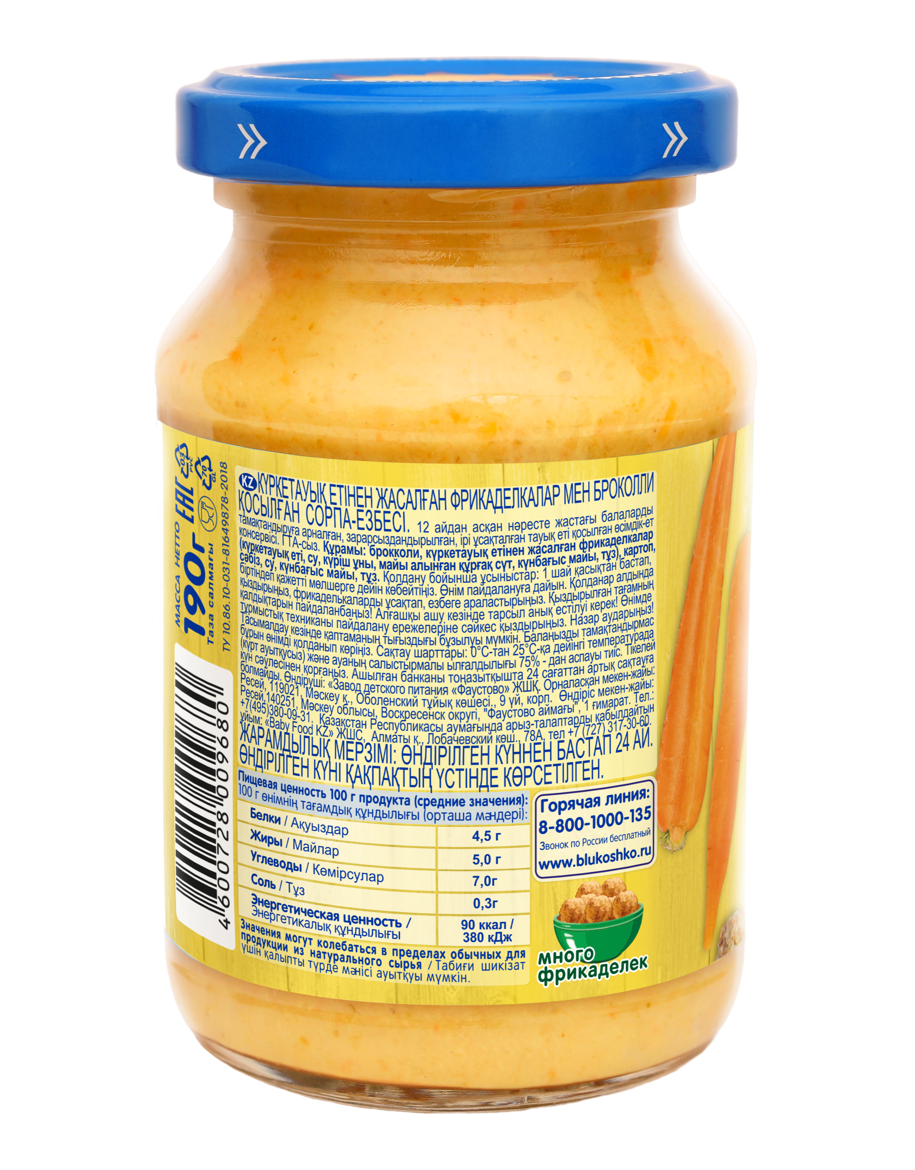 капуста брокколи, фрикадельки из индейки (филе индейки, вода питьевая, мука рисовая, молоко сухое обезжиренное, масло подсолнечное, соль), картофель, морковь, вода питьевая, масло подсолнечное, соль.