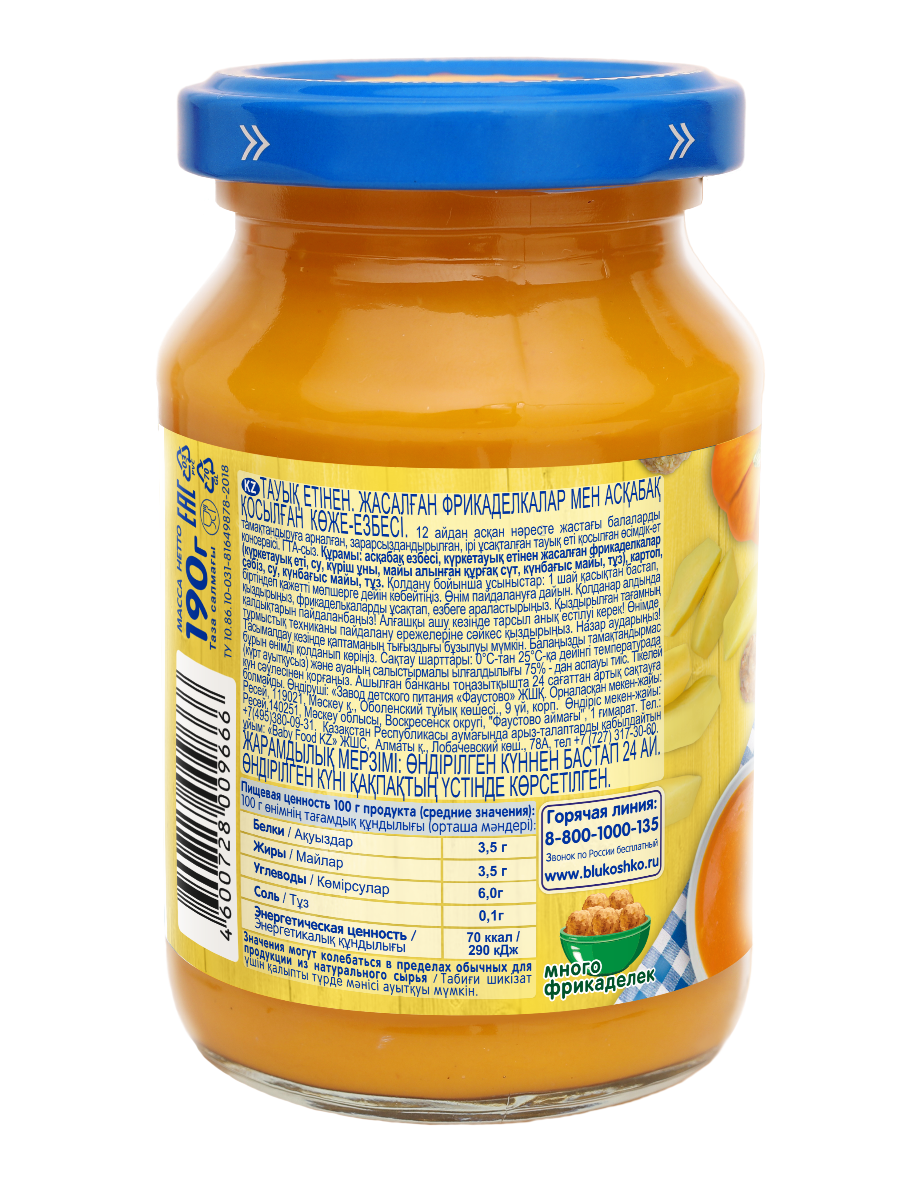 пюре из тыквы, фрикадельки из цыпленка (мясо цыплят, вода питьевая, мука рисовая, молоко сухое обезжиренное, соль), пюре из моркови, картофель, вода питьевая, масло подсолнечное, лук.