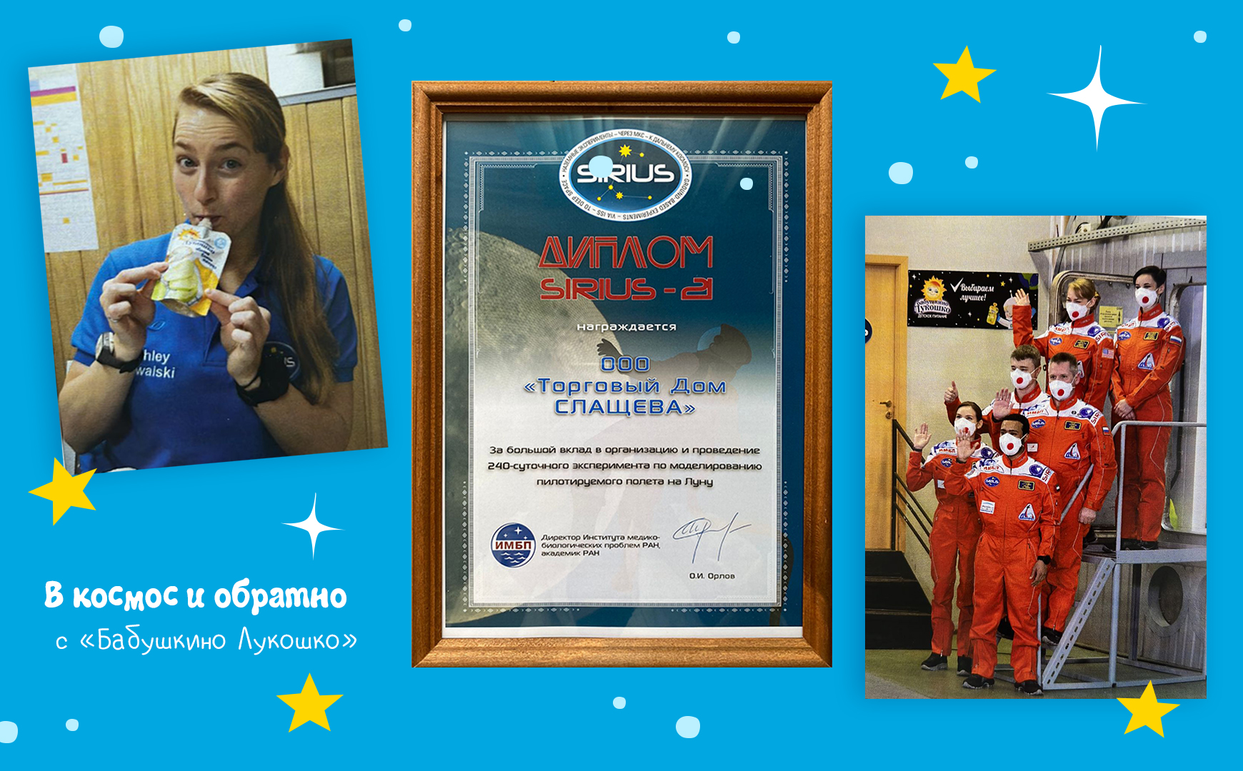 Продукция «Бабушкино Лукошко» прошла строгий отбор в данный проект, была опробована и проверена многонациональным экипажем Sirius и признана качественной и пригодной к использованию для питания в условиях космического полёта. Все виды нашей продукции в мягкой упаковке были использованы космонавтами в качестве питания между основными приёмами пищи.