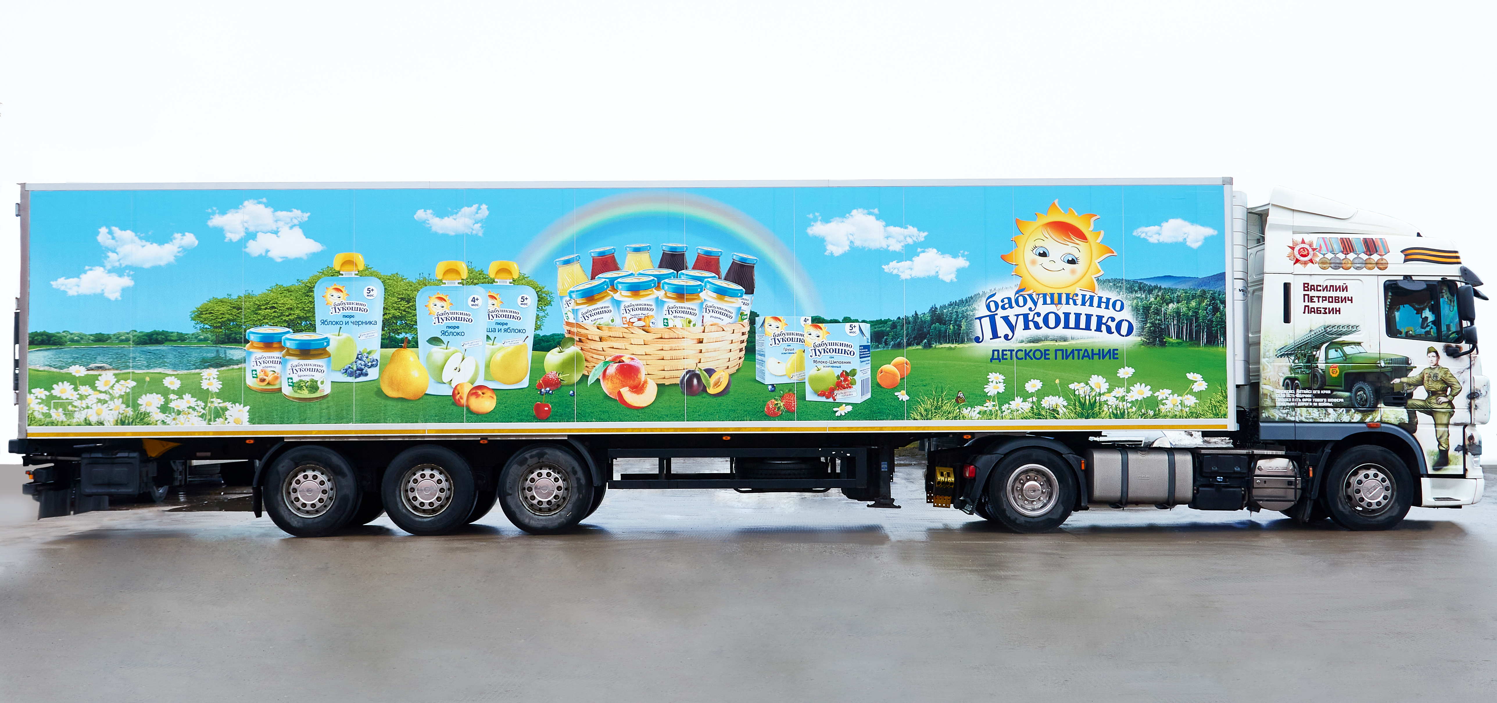 Василий Лабзин, владелец Группы компаний «СИВМА», осуществляющей производство и доставку детского питания «Бабушкино Лукошко» во все уголки нашей родины, в память о своем отце фронтовом шофере Василии Петровиче Лабзине нанес его изображение на кабину тягача. Этот автомобиль – пример глубочайшего уважения отцам, дедам и прадедам, прошедшим Великую Отечественную войну и навсегда оставшимся в наших сердцах.