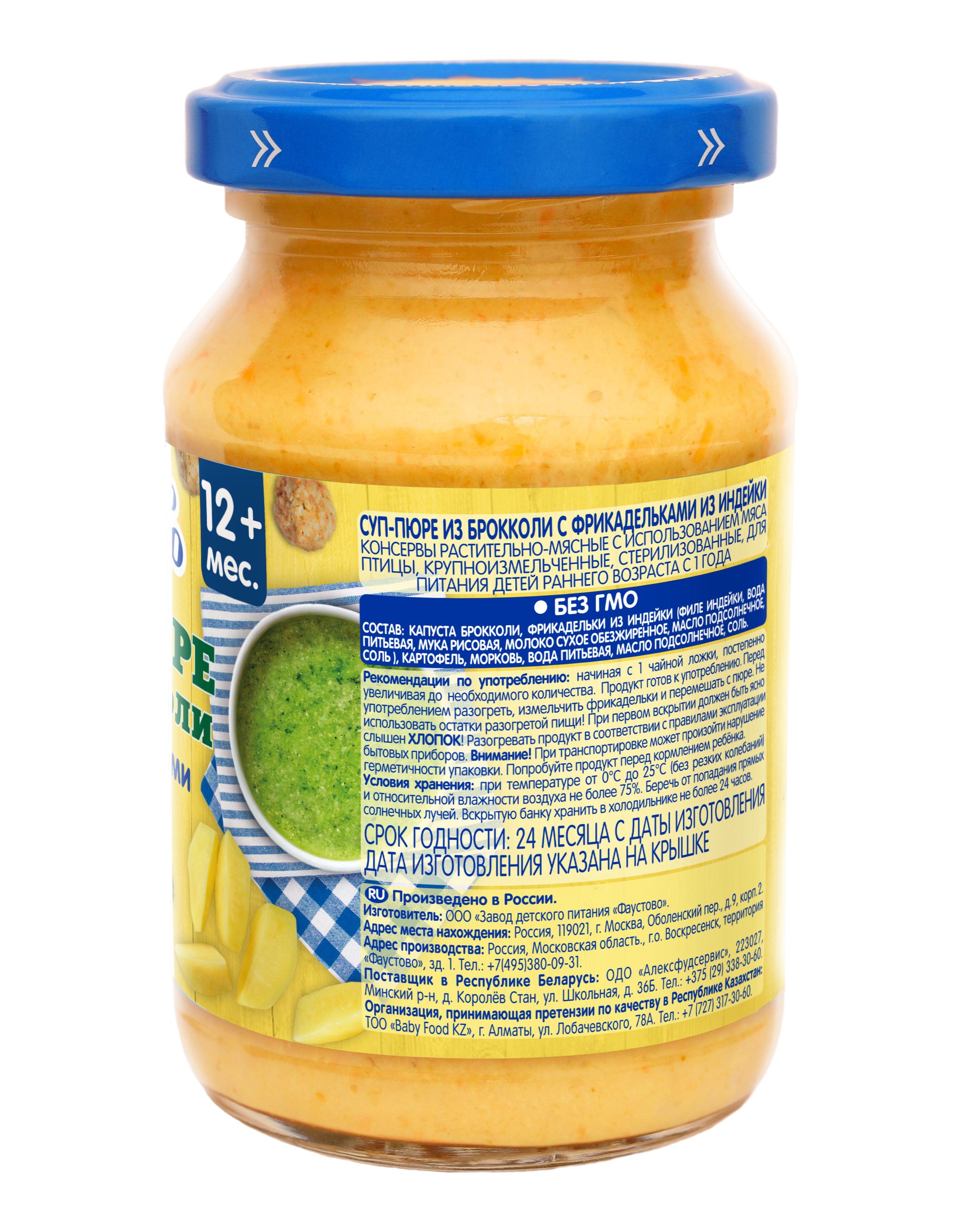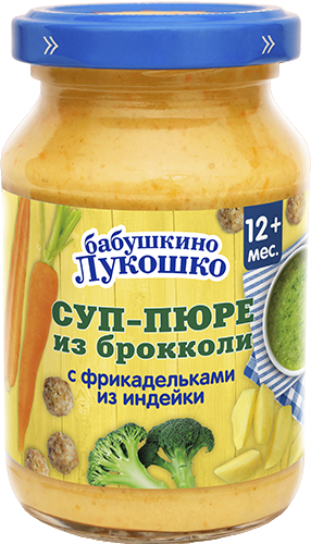капуста брокколи, фрикадельки из индейки (филе индейки, вода питьевая, мука рисовая, молоко сухое обезжиренное, масло подсолнечное, соль), картофель, морковь, вода питьевая, масло подсолнечное, соль.