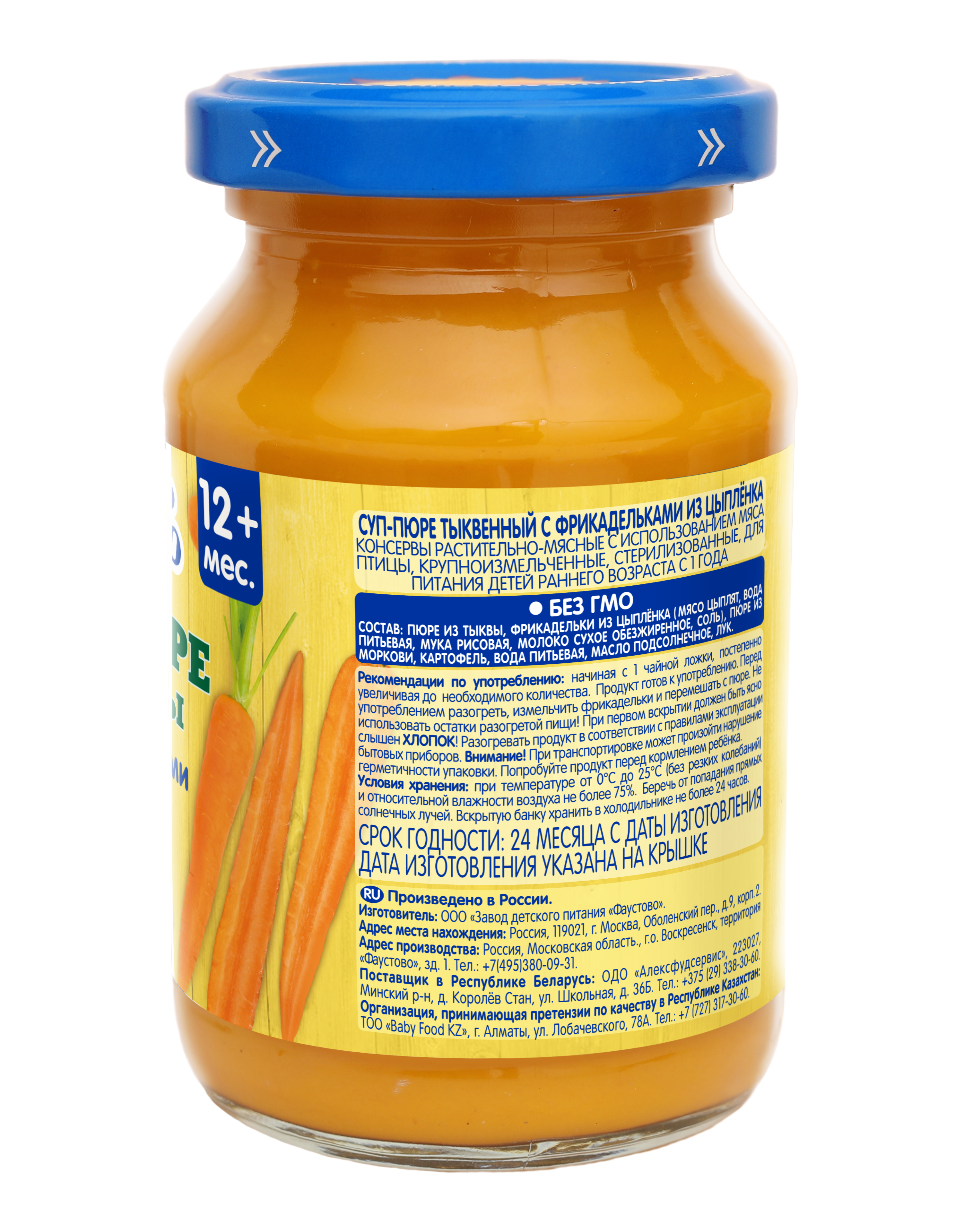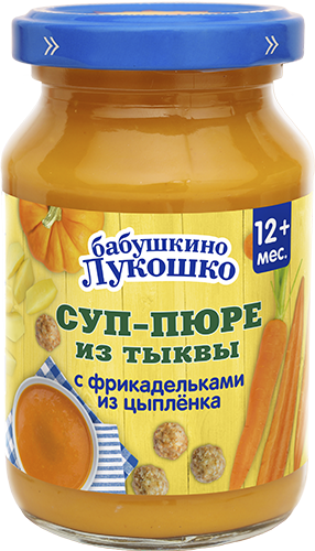 пюре из тыквы, фрикадельки из цыпленка (мясо цыплят, вода питьевая, мука рисовая, молоко сухое обезжиренное, соль), пюре из моркови, картофель, вода питьевая, масло подсолнечное, лук.