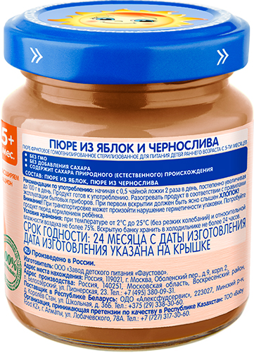 Состав: Пюре из яблок и чернослива. Содержит сахара природного (естественного) происхождения.