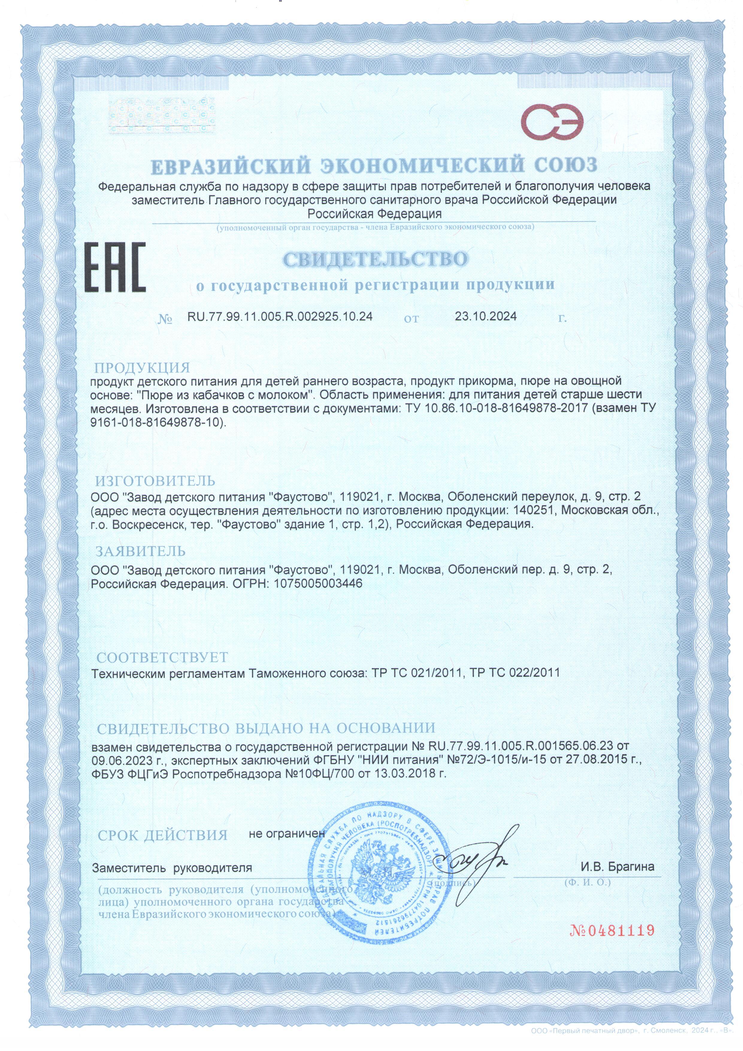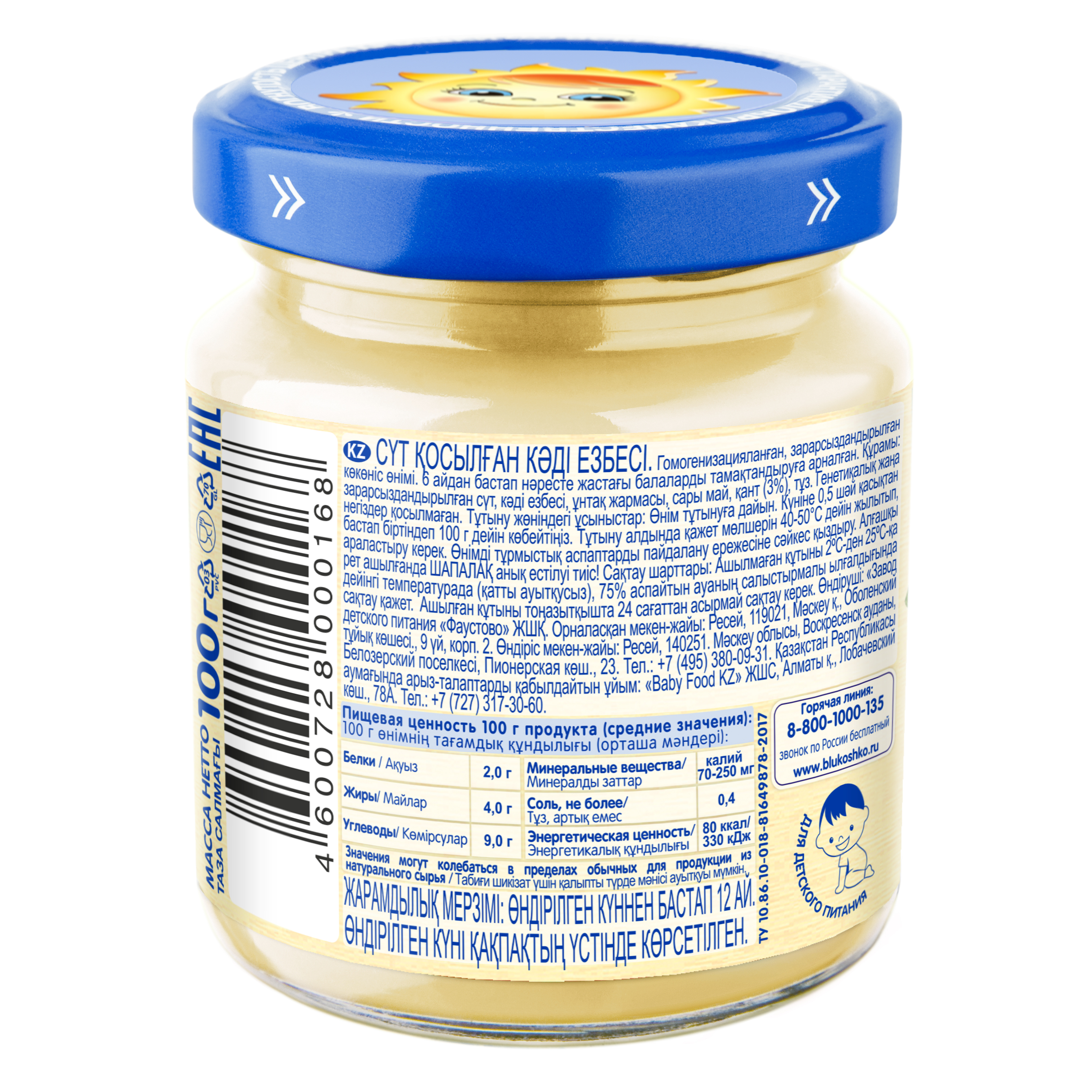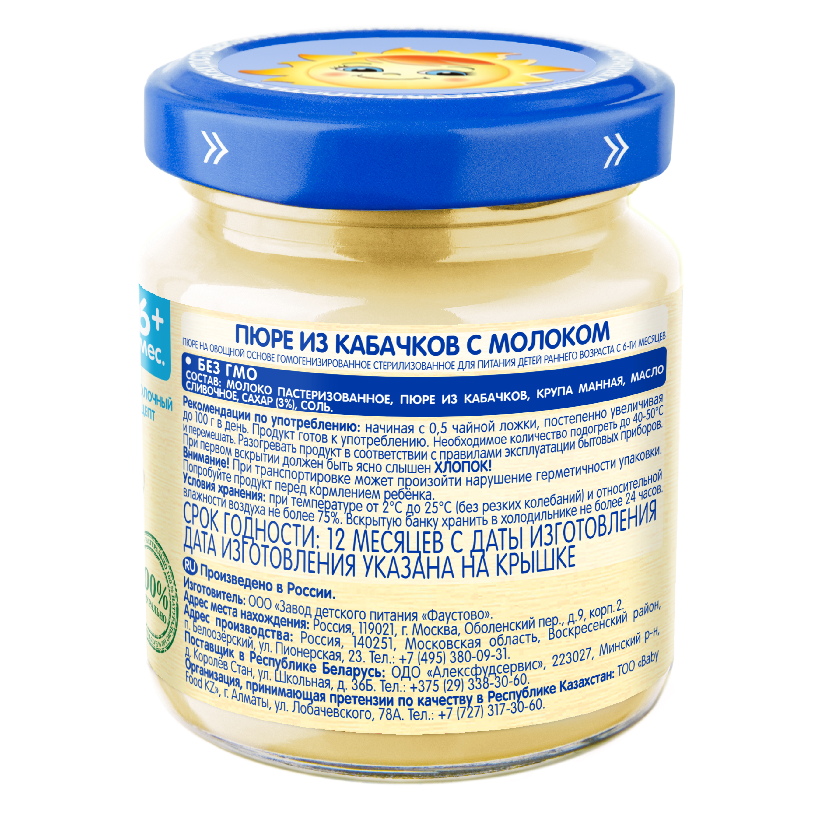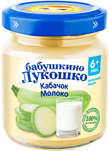 Состав: Молоко пастеризованное, пюре из кабачков, крупа манная, масло сливочное, сахар, соль